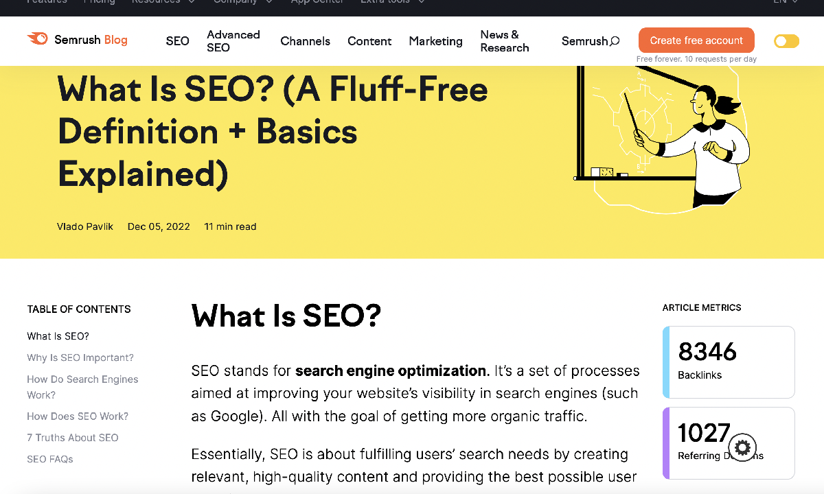 Semrush burada SEO hakkında “Nedir?” odaklı bir blog içeriği sunuyor. Her alt başlık ise solda görebileceğiniz üzere “İçindekiler” tablosu ile düzenlenmiş durumda. Temel kavramlara dayalı olan bu içerik, SEO hakkında hiçbir şey bilmeyen ya da az şey bilenler için önemli bir giriş seviyesi metni sunuyor. Daha gelişmiş okuyucu kitlesi içinse küme sayfalarına bağlantı veriliyor. Ayrıca yazı içerisindeki resim, video ve grafikler, içeriğin özümsenmesini kolaylaştırıyor.