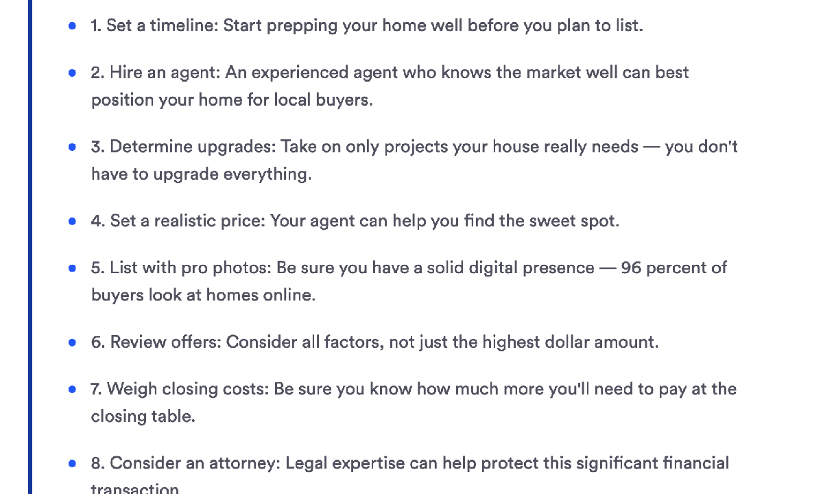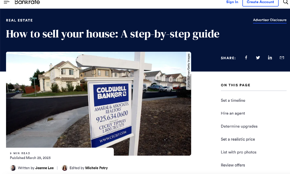 Bankrate bu içeriğini önce 2022’de yazmış, sonra 2023 için güncellemiş. Öncelikle bu güncelleme için teşekkürler! Ev satma adımlarını anlatan bu içerik kronolojik adımlarla düzenlenen küme konularından oluşuyor. Her adım bağlantılı ve linkler, ilgili bölümlere götürüyor. Sağ tarafta yine “İçindekiler” tablosu var. Dahası, giriş bölümünde kıssadan hisse misali “Key takeaways” bölümü var. Burada, sütun içeriğindeki tüm alt başlıklar madde madde sıralanıyor ve birkaç cümle ile özetleniyor. Ardından aşağıya kaydırdığınızda genel bilgilerin sunulduğu tüm alt başlıkları görüyorsunuz. Ve her alt başlık, küme sayfalarına gidebileceğiniz linklerden oluşuyor. “Key takeaways” bölümünü de aşağıda paylaşıyorum: