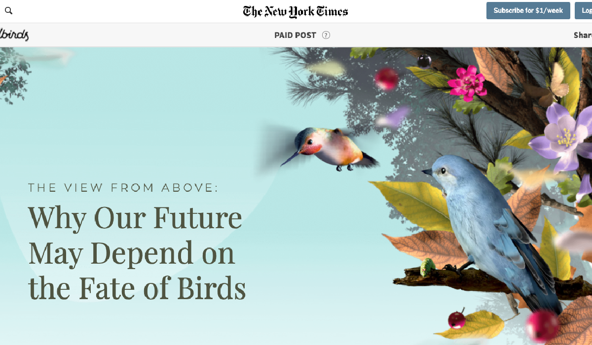 Şimdi vereceğimiz doğal reklam örneği, verdiğiniz reklamın mutlaka markanızla ilgili olmak zorunda olmadığını kanıtlıyor. Ayakkabı şirketi Allbirds, bir New York Times makalesini destekleyerek doğal reklama imza attı. Bu reklam, platformun doğal haber akışında sponsorlu olarak yer aldı ve yayın içi reklamcılığa bir örnek oldu. Kullanıcılar platformdaki makaleye tıkladıkları zaman New York Times’ın internet sitesinde etkileyici grafiklerin, ses efektlerinin olduğu benzersiz bir sayfaya yönlendirildiler. New York Times’ın ilgili makalesi ise kuşların çevremizdeki değerlerine, iklim değişikliği nedeniyle risk altında olduğuna odaklanıyordu. Bu da içinde “kuş” (birds) sözcüğü geçen Allbirds markasının sürdürülebilirliğe yaptığı bir vurgu oldu. Başında da dediğimiz gibi; her reklam bizzat markanızla alakalı olmak zorunda değil.