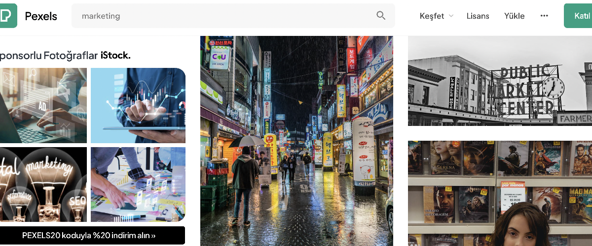 iStock telifsiz, uluslararası mikro stok fotoğraf sağlayıcısı bu alanın en bilinen platformlarından biri. Pexels de benzer bir diğer platform olarak hazır fotoğraf ve hazır görüntü sağlayıcısı. Yukarıdaki görselde fark edebileceğiniz üzere Pexels internet sitesinde “Marketing” sözcüğünü arattım ve sonuçlar içerisinde sponsorlu bir iStock reklamı da yer alıyor. Bu da yayın içi reklamlara güncel ve popüler bir diğer örnek.
