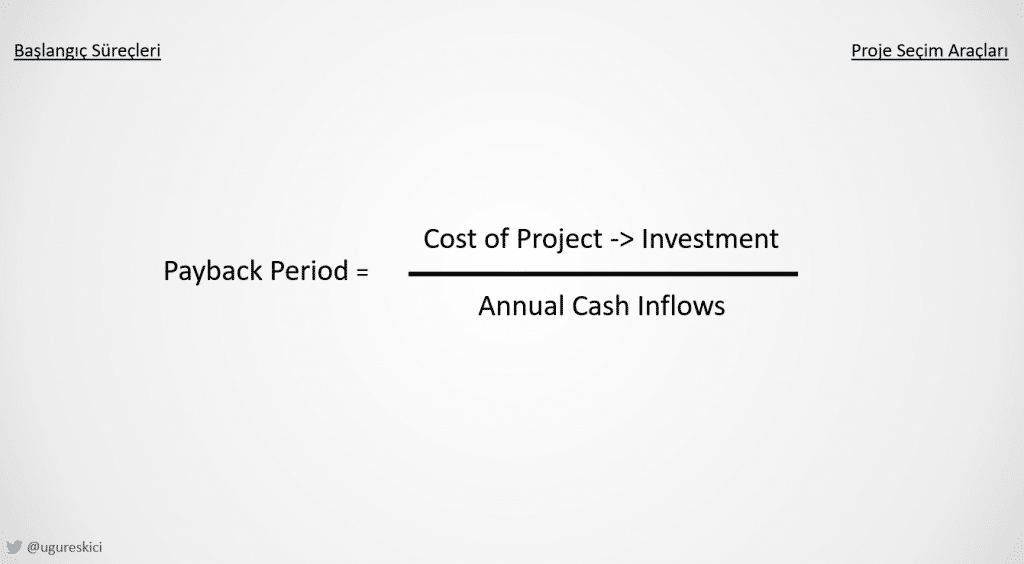 Geri Dönüş Süresi (Payback Period) ise projenin ilk yatırım maliyetini geri ödemesi için gerekli olan süredir. Bu da yine proje seçim aşamalarında sık kullanılan yöntemdir. Projeler, zaman ve maliyet kapsamında masaya yatırılır ve IRR + geri dönüş süresi baz alınarak seçim yapılır.