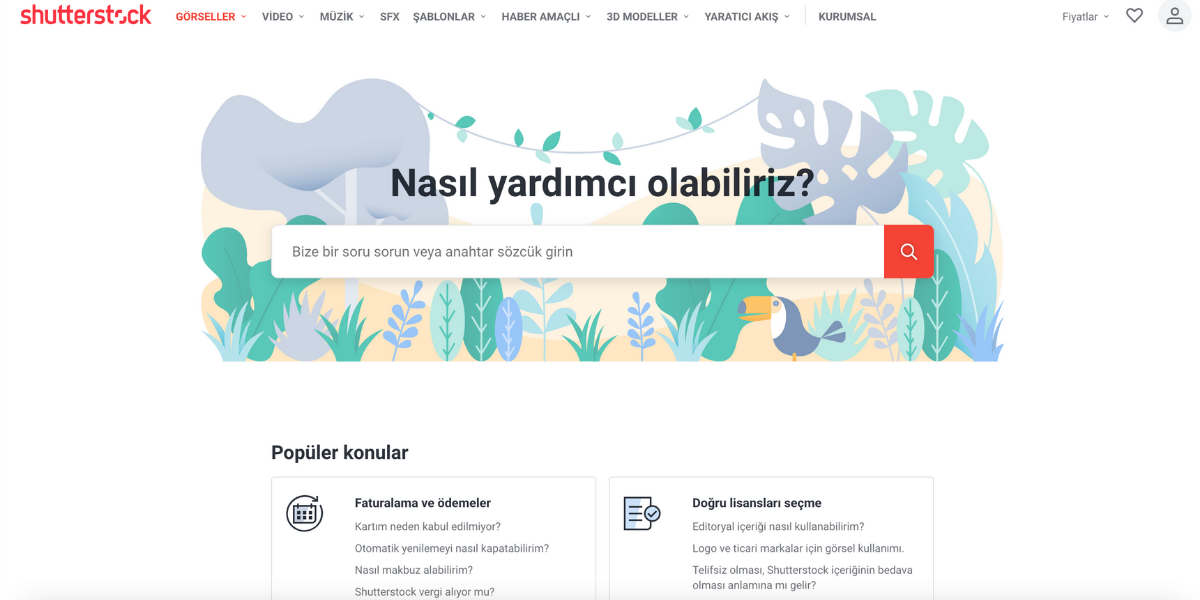 Shutterstock yardım merkezi sayfası da sınavı bir hayli yüksek puanla geçiyor. Burada da diğer teknoloji devleri ile benzer bir temayı görüyoruz: Arama kutucuğu ve hemen altında yardım konuları başlıkları. Shutterstock’ın diğer ikisinden farkı ve belki eksiği ise arama kutucuğuna kelime girdiğinizde hemen altında yardım başlıkları listelenmiyor. Yani yazıp enter’a basmanız gerekiyor. Bana kalırsa bu, bir tık olumsuz bir deneyime yol açabilir.