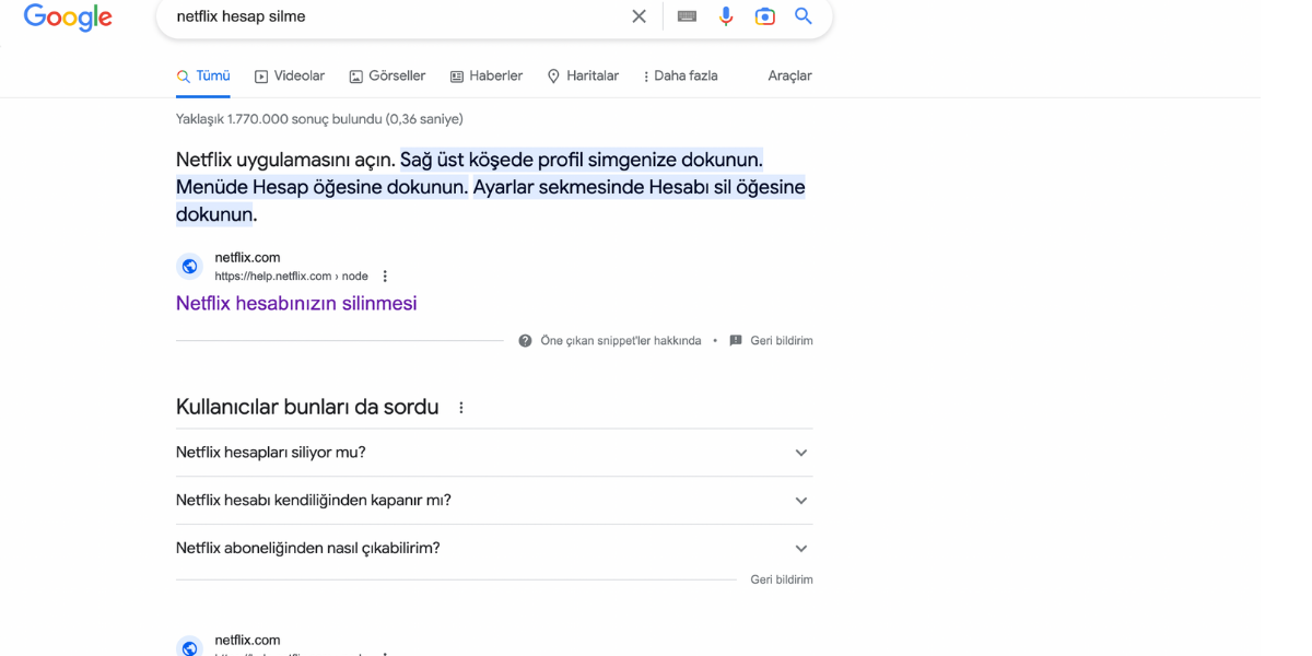 SSS sayfanız arama motoru dostu bir internet sitesi oluşturmanıza da yardımcı olur. Bu noktada sorularınızın her birini ayrı bir sayfaya bağlayarak, Google’ın yanıtlarınızı onları arayan kişilere göstermesine yardımcı olabilirsiniz. Örneğin, Google’a “Netflix hesap silme” yazarsanız doğrudan sitenin ilgili SSS bölümüne gidebileceğiniz bağlantı en üst sırada çıkar: