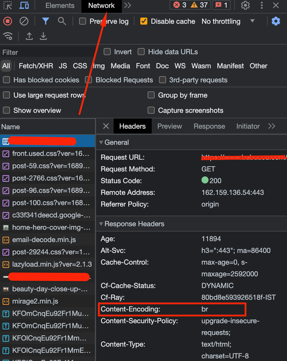 Network ekranına girdiğimizde sol taraftaki istek listesinden sayfanızın URL’i seçmeniz gerekiyor akabinde “Headers” menüsü altında “Content-Encoding: br” yazıyorsa sitenizde brotli sıkıştırma yöntemi kullanılıyor demektir.