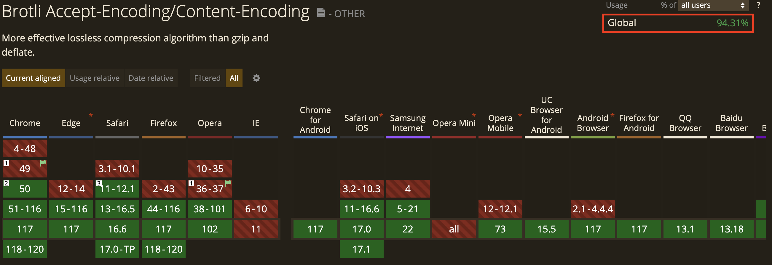 Web tarayıcıları ve sunucuları, Brotli’yi desteklemeye başlamış ve bu da daha fazla web sitesinin bu teknolojiyi kullanmasını teşvik etmiştir. Sonuç olarak, Brotli’nin web dünyasındaki etkisi giderek büyümektedir. Genel itibarıyla baktığımızda %95 oranında tarayıcılar tarafından desteklenmektedir. Brotli, web sitelerinin hızını artırmak ve veri transferini optimize etmek için kullanılır. Mobil uygulamalar, API’ler ve daha fazlası da Brotli’yi kullanabilir.