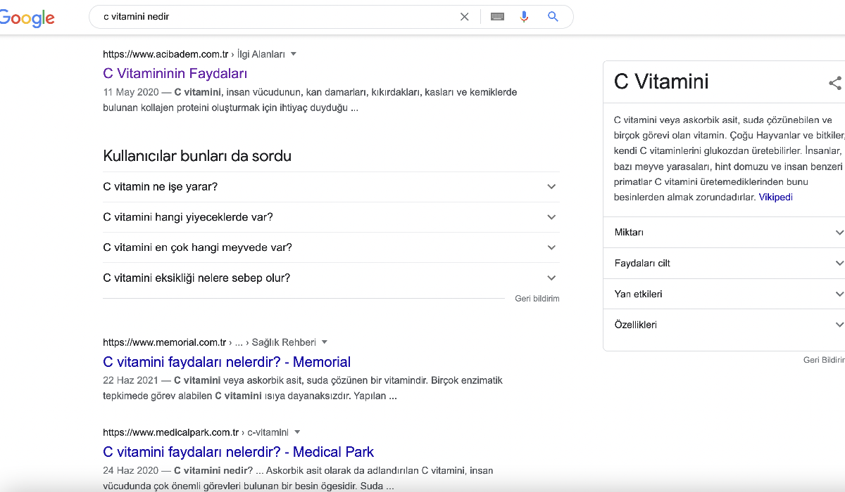 EAT’nin birincisi expertise, yani uzmanlıktan oluşuyor. Örneğin, mesleğinde yılları geride bırakmış bir moda tasarımcısının bir kombini incelemesi ile konuya o kadar da vâkıf olmayan birinin kombin incelemesi farklılaşacaktır. İçerik konunun uzmanlarınca yazıldığı zaman Google bunu fark edebiliyor. Yukarıdaki görsele bakarsanız, “C vitamini nedir” sorgusundaki ilk üç sıra çeşitli hastanelerin web sitesine ayrılmış durumda. Bununla beraber tabii ki Google nezdinde belirli bir konuda uzman olmanız için bir dereceye sahip olmanız şart değil. Bu açıdan konuyla alakalı bir lisans eğitimi ve diploması önem teşkil edebileceği gibi, okuyup araştırarak konu hakkında derin bilgi sahibi olmanız da kabul edilebilir. Örneğin, bir yemek tarifi içeriği hazırlamak için aşçılık okulunu bitirmek zorunda değiliz. Bunu, yapa yapa da öğrenebilir ve deneyimlerimizi içerik formatında paylaşabiliriz. Öte yandan, eğitimi ve deneyimi olmayan birinin beyin cerrahlığı hakkındaki uzmanlığı da gerçekçi değildir. Bu noktada içeriği hazırlayan yazarın uzmanlığı, içeriğin derece ve düzeyine göre değerlendirilir. Örnekleri artırmak mümkün: Beyoğlu’nu anlatan hoş bir blog yazısı okuyorsunuz fakat içeriğin yazarı Kanada’da yaşıyor ve yalnızca internette bulduğu bilgilerden derleme yapmış olabilir. İyi araştırılmış, özgün ve kaliteli bir içerik ise bu içeriğin yazarı da bir uzman statüsünde değerlendirilir. Maddelemek gerekirse: