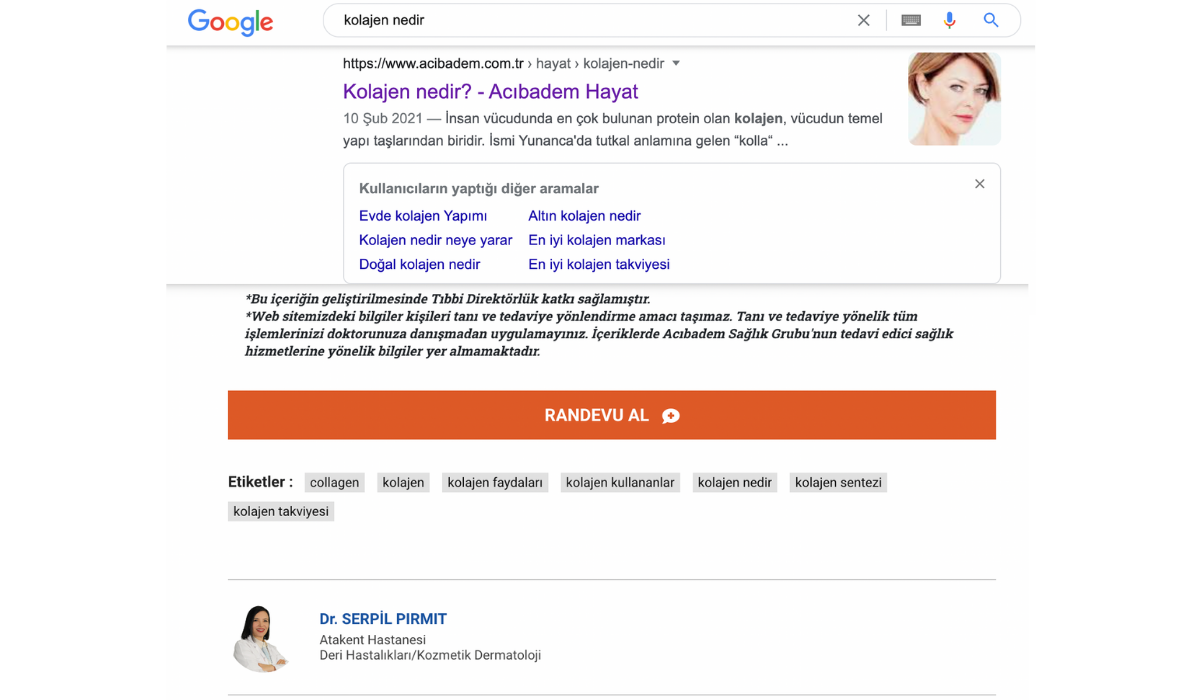 “Otoriterlik” diye de geçen Authoritativeness, bu konu özelinde karşımıza “yetkinlik” olarak çıkıyor. Hemen açalım: İçeriğiniz üzerindeki hâkimiyetiniz, yetkinlik ve otoriteniz bu konu başlığında karşımıza çıkıyor. Burada yalnız içeriğin yetkinliği değil, internet sitesinin yetkinliği de büyük önem taşıyor. Harika bir haber içeriği hazırladınız fakat bunu güvenilirlik kazanmamış, şaibeli bir internet sitesinde yayımladınız diyelim. Çabalarınız muhtemelen boşa çıkacaktır. İnternet sitesinin tamamının kullanıcıların aradığı değerli içerikler ile dolu olması elzem. Bu, arama motoruna yetkinliğinizi gösterecektir. Aşağıdaki görseli inceleyin. Google’da “kolajen nedir” sorgulaması yaptım ve ilk sonuçlardan birine girdim. İlgili içeriğin yazarı altta paylaşılmış ve içeriğe dair çeşitli notlar da yer alıyor:
