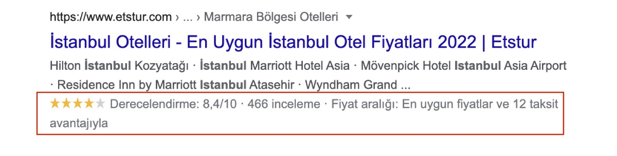 Rich snippet örnekleri çok çeşitlidir ve bazen bir derecelendirme bazen bir yorum bazen de bir fiyat aralığı olarak karşınıza çıkabilir. Bir örnekle ilerleyelim. Google arama motoruna “İstanbul Otelleri” yazdınız ve yine karşınıza pek çok sonuç sayfası çıktı. Görselde de görebileceğiniz gibi bu sonucun rich snippet özelliğine sahip sayfasında derecelendirme / puanlama, inceleme, fiyat aralığı gibi pek çok ek veri gösteriliyor. Bu sayede kullanıcılar İstanbul otelleri hakkında içeriğe tıklamadan dahi önden daha kapsamlı bilgi alabiliyor. Ayrıca aynı özellik, rich snippet’a sahip sonuç sayfasına kullanıcıların tıklama ihtimalini de artırabiliyor.