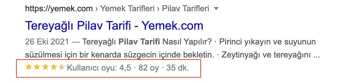Bir de yemek tarifleri üzerinden gidelim. Google’a “pilav tarifi” yazdığımız zaman bu kez rich snippet özelliğine sahip birden fazla sonuç çıkıyor. Kullanıcı oyu, yemeğin yapım süresi, açıklama (description) bölümünün hemen altında konumlandırılıyor. Zaten belirli bilgi türlerine sahip sayfalar için görünebilen rich snippet örneklerini en çok görebileceğiniz alanlardan biri hiç şüphesiz ki yemek tarifleri.