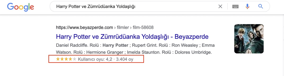 Örneğin, fantastik film meraklısı biri olarak Google’da “Harry Potter ve Zümrüdüanka Yoldaşlığı” ifadesini arattınız ve karşınıza farklı pek çok sonuç çıktı. Bu sonuçlarda URL, içeriğin başlığı (title) ve açıklama (description) bölümleri yer alıyor. Bunlar, tıkladığınız zaman karşınıza çıkacak içeriğe dair alabileceğiniz ön bilgiler. Rich snippet özellikleri itibarıyla burada ayrılıyor. Rich snippet özellikli sonuç da URL, içerik başlığı ve açıklama bölümü ile karşınıza çıkıyor fakat bir farkla: İlgili sonuca ayrılan bölümde derecelendirme, kullanıcı oyu gibi bilgileri de görebiliyorsunuz. Demek, içeriğin başlığı, URL bölümü ve Google sonuçları için yazılan açıklamasının yanı sıra izleyicilerin değerlendirmelerini de burada görebiliyoruz. Bu sayede filme dair yapılan yorumlar, eleştirileri de belli ölçüde görebiliyoruz.